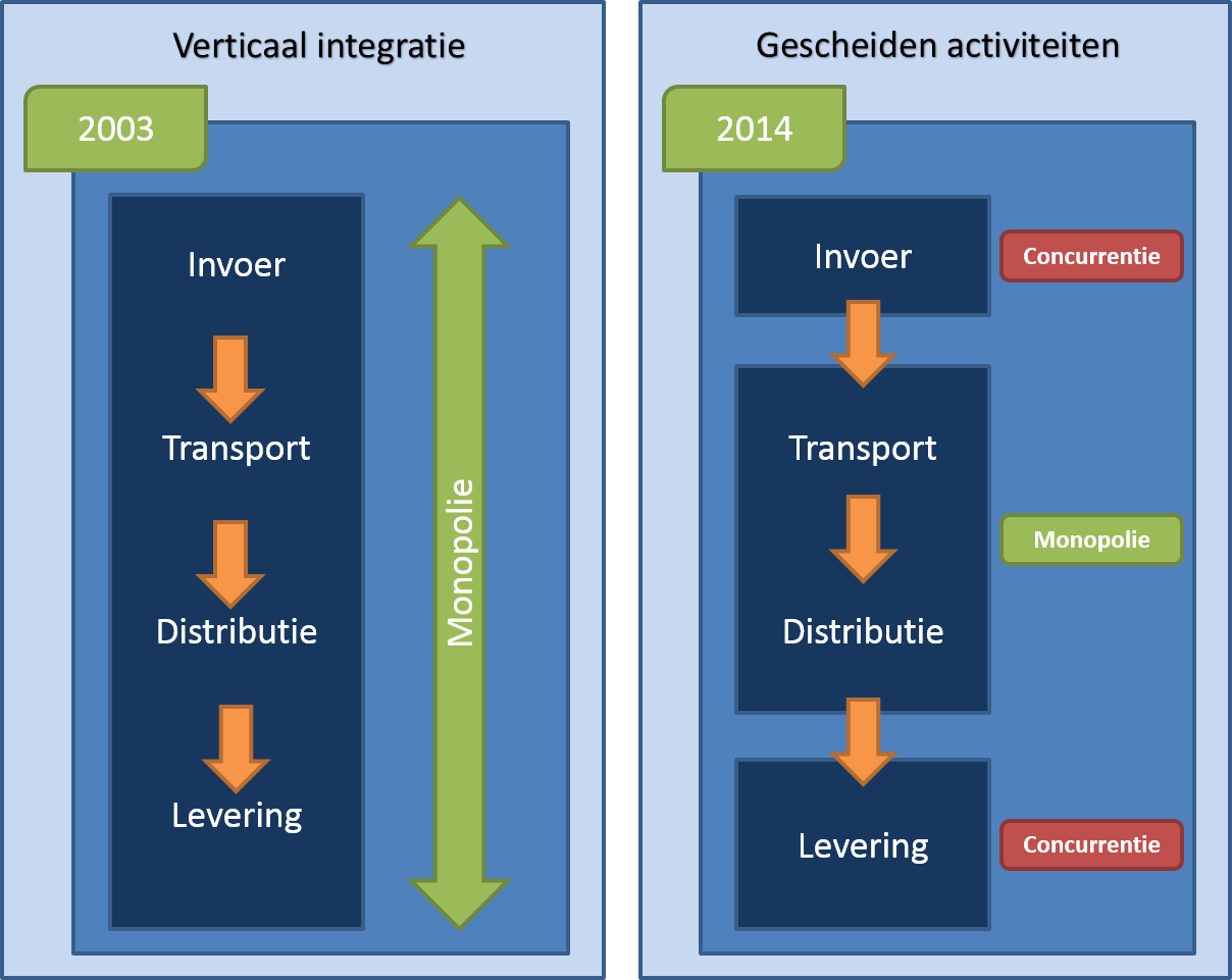 In het verleden was de gassector een sector met een beperkt aantal verticaal geïntegreerde ondernemingen: productie, invoer, transport, distributie en verkoop waren onlosmakelijk met elkaar verbonden. Om in de geliberaliseerde markt identieke concurrentievoorwaarden tussen de verschillende gasleveranciers te waarborgen, is de invoer en verkoop van gas losgekoppeld van het transport en de distributie ervan. Dit proces leidde op de Belgische gasmarkt tot het ontstaan van nieuwe bedrijven en tot het aantrekken van buitenlandse bedrijven.